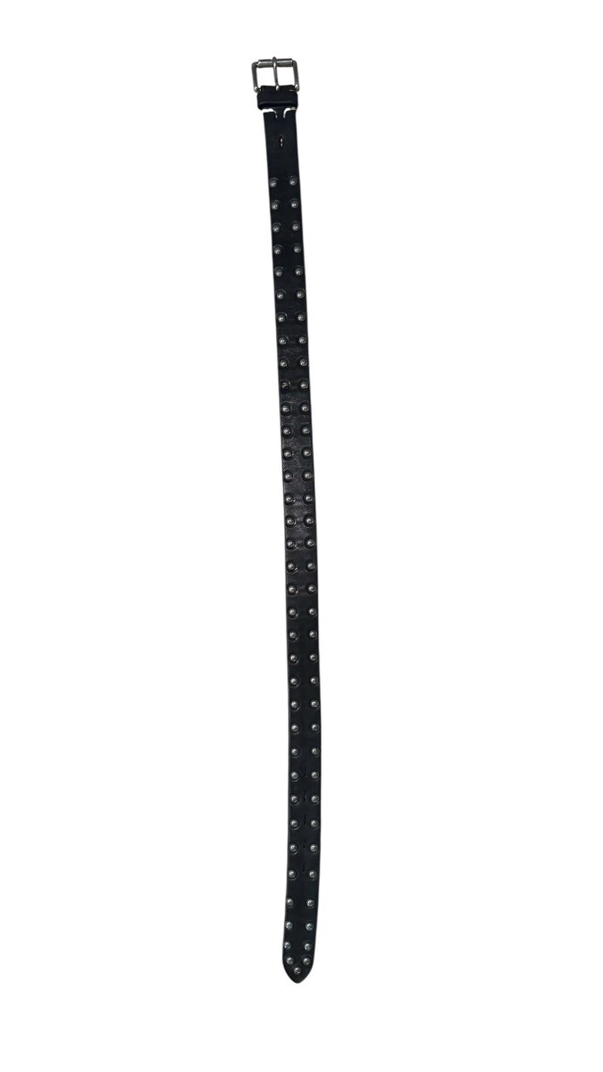 今回はインクブルーカラーのレザー仕様でスタッズがほどこされた仕様です。立体的な形状のシングルピンでループの部分にもベルトループがつきます。