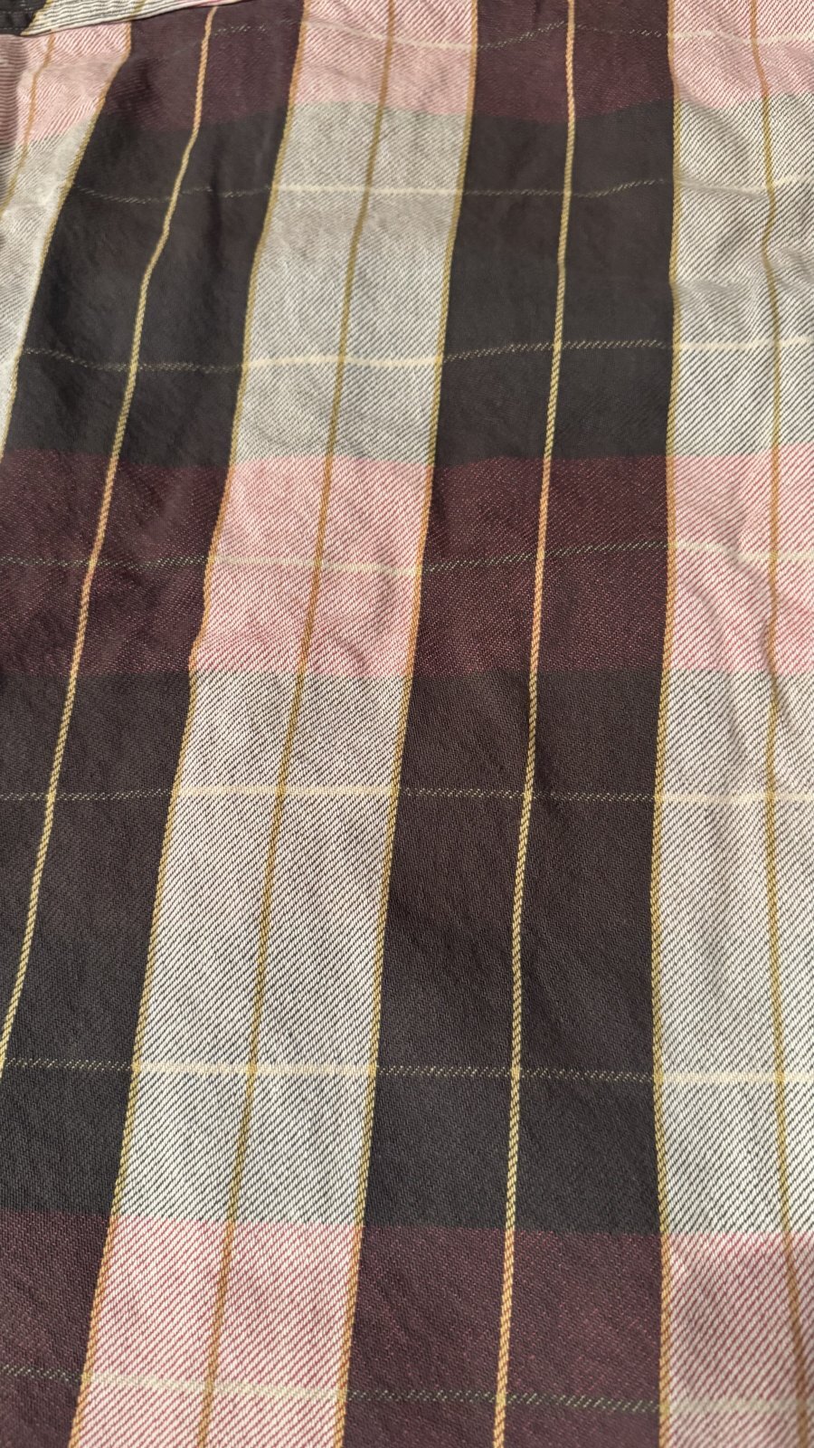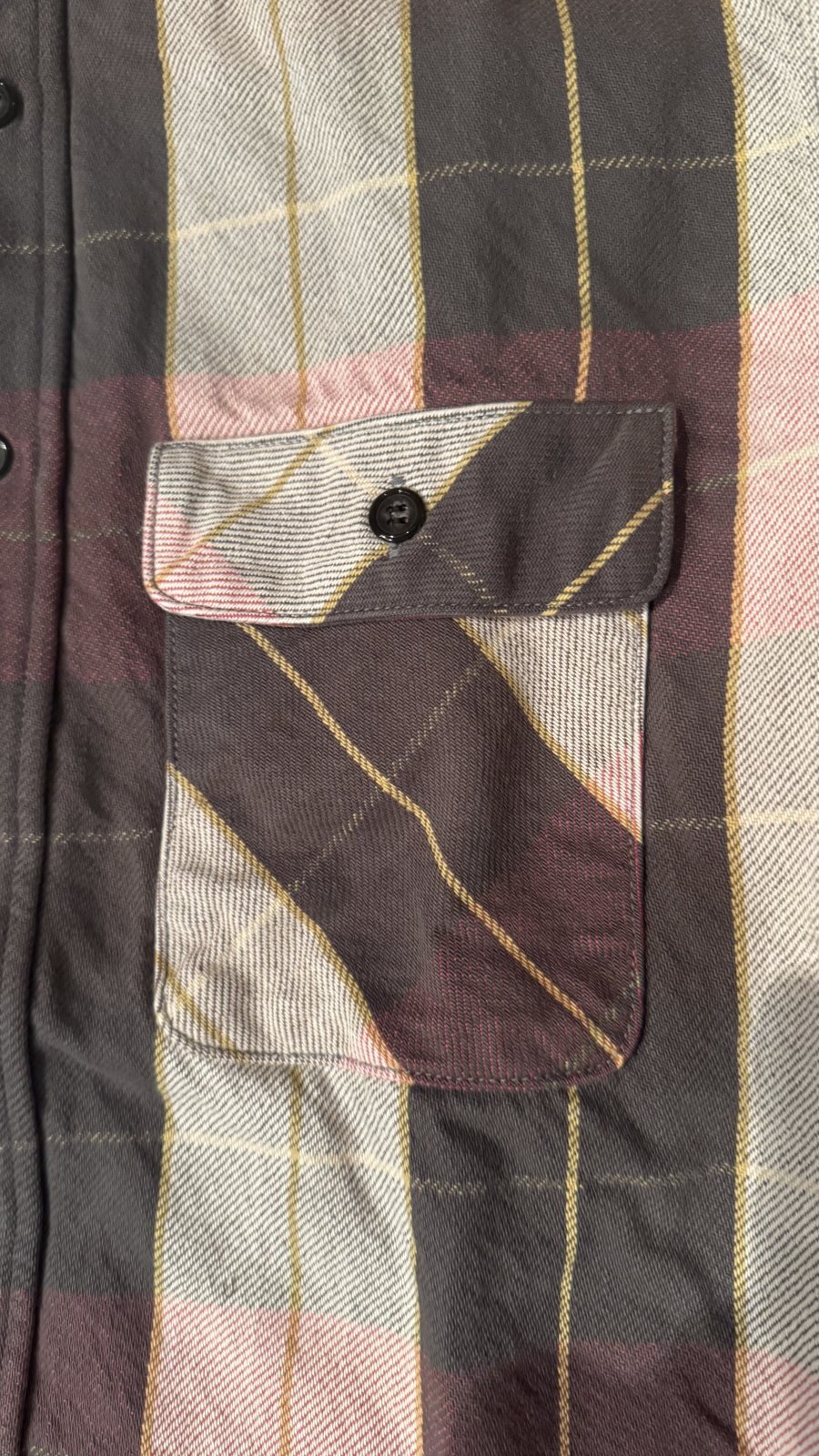 もう1種類のレギュラー丈のネルシャツとの違いは、ジャストサイズで着用して頂くとハッキリとわかるのですが、レギュラー丈の物に比べると肩幅が広く、身幅は狭く、少し腕の長さも長い形となります。