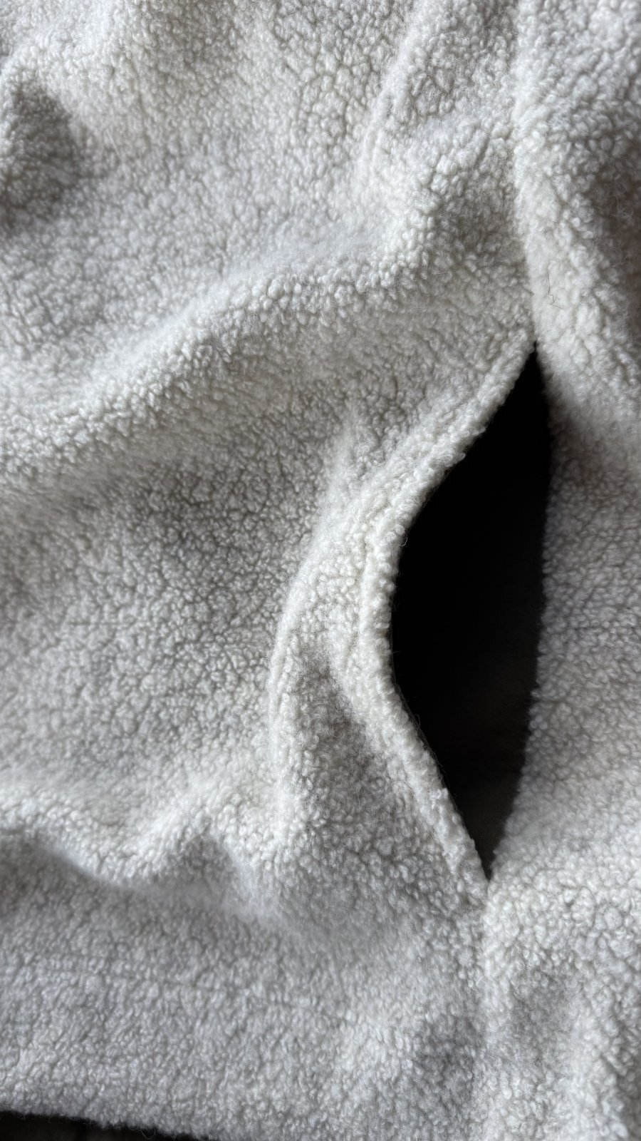 オーバーサイズの商品ですので脇線にはハンドウォームポケットを完備、脇線を前に振り手を入れやすくしております。