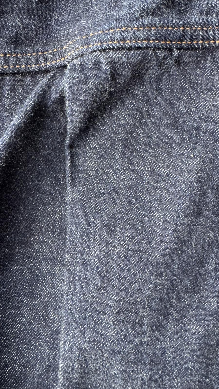 ※当製品は着心地を追求する為、旧式の織機によって作られたデニム地を使用しており、綿が本来持っている伸縮性、弾力性を実現しています。その為、布地の特性上、商品に約1〜2センチ程度の個体差が生じる場合がございます。また、サイズ表記につきましても、実物を実際に採寸し、平均値を出したものを記載しております。