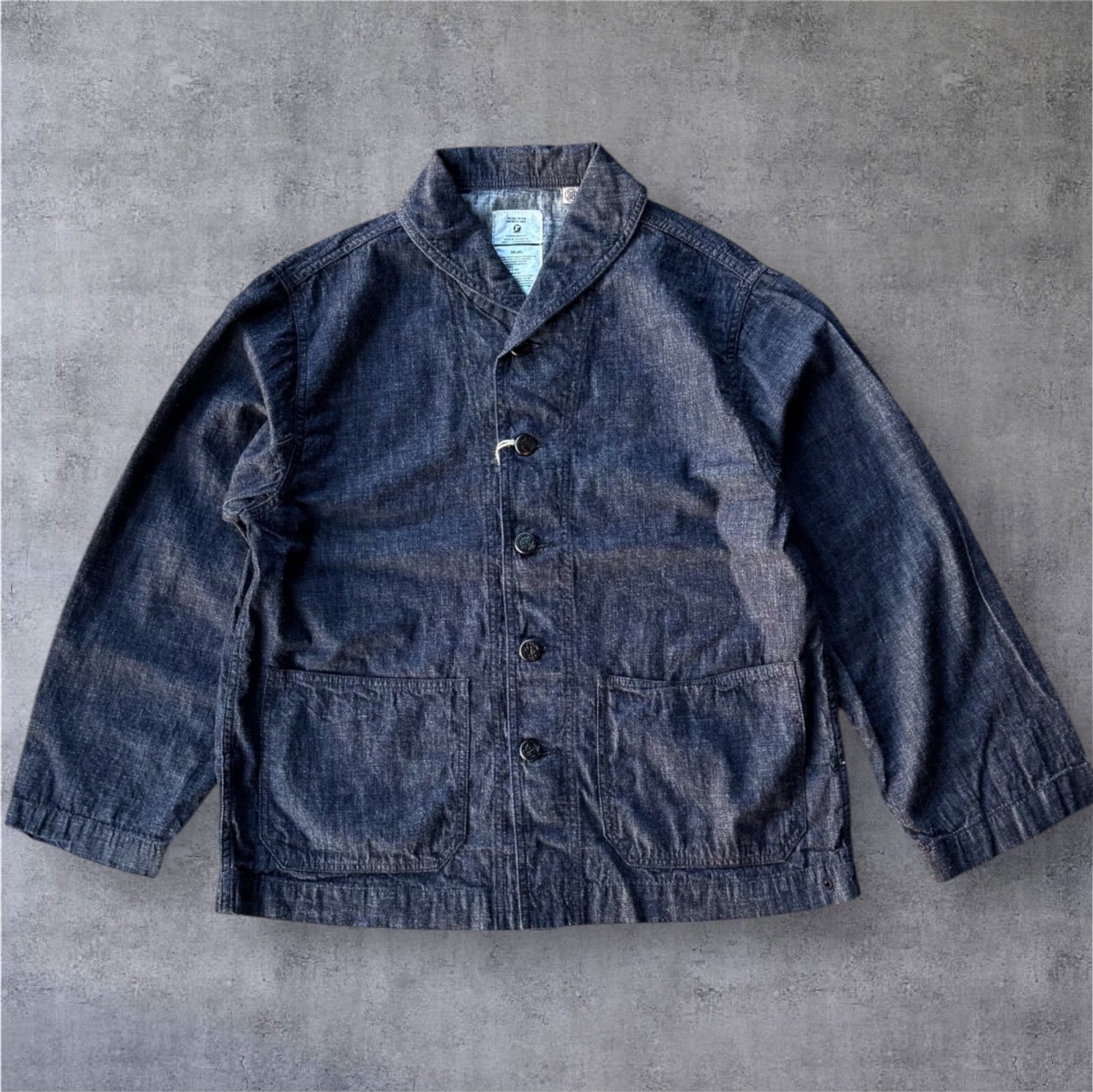 見た目の想像を確実に裏切るその素材の軽さとしなやかさが病みつきになるジンバブエコットン8ozデニムを使用したショールカラーカバーオール。