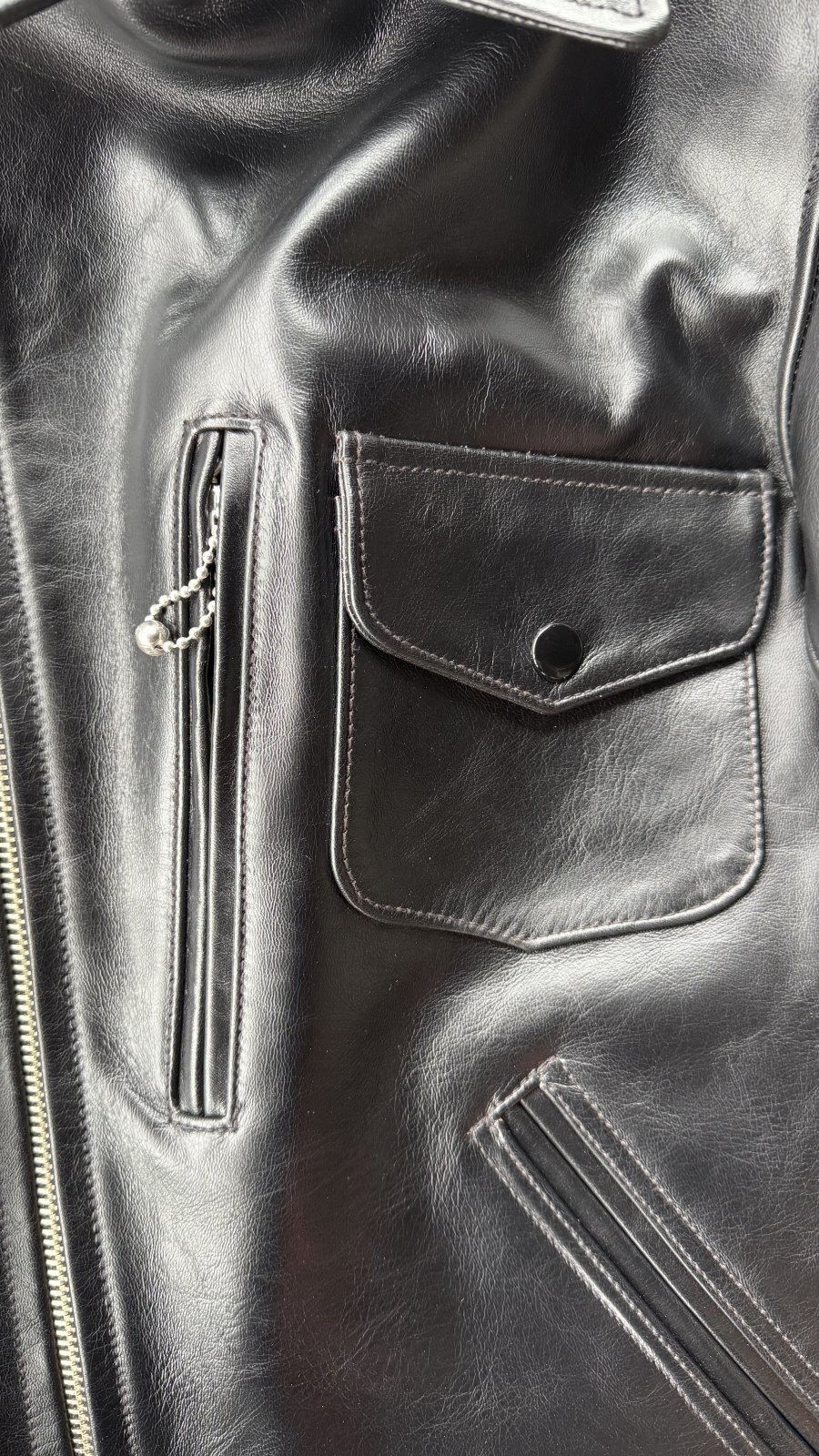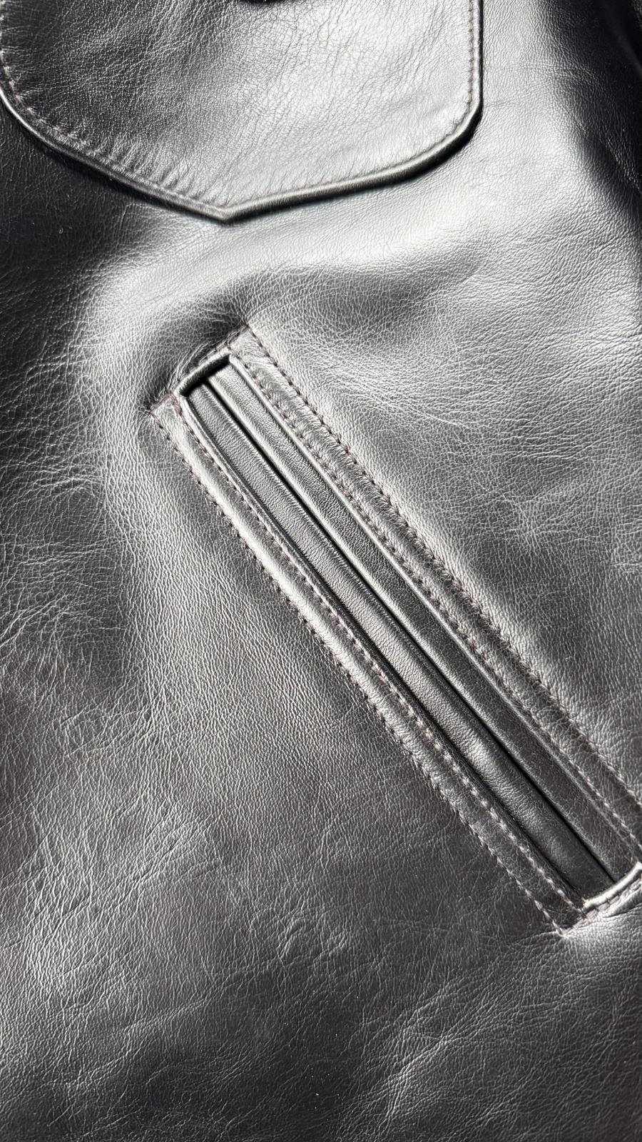 圧巻はシルエット! 全体のシルエットは勿論の事、背中の仕様もシンプルで胸のポケットが印象的で他のレザージャケットには中々見られない仕様が目をひきます。