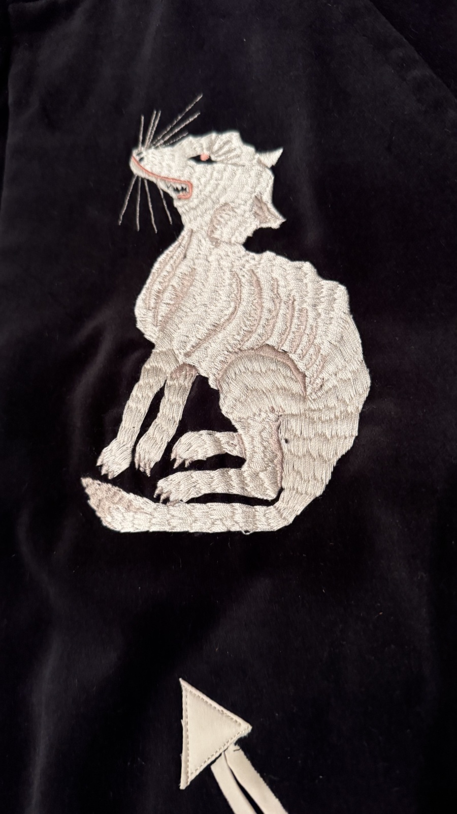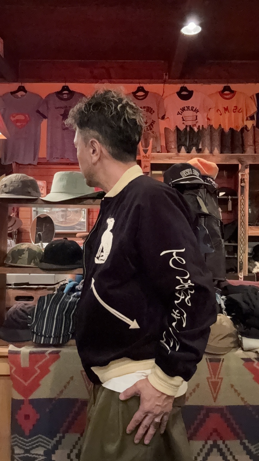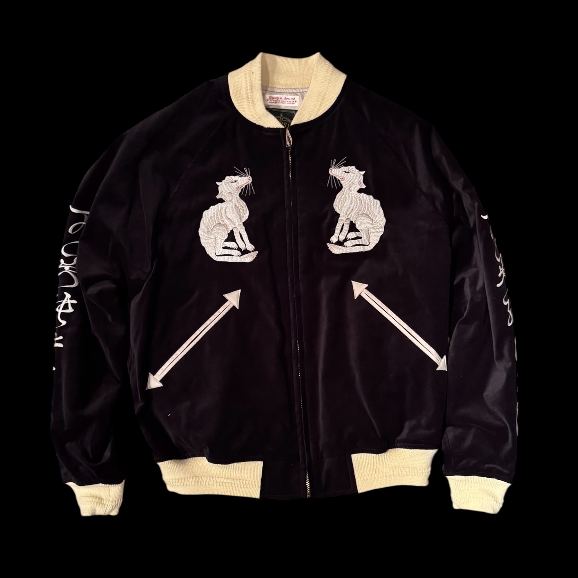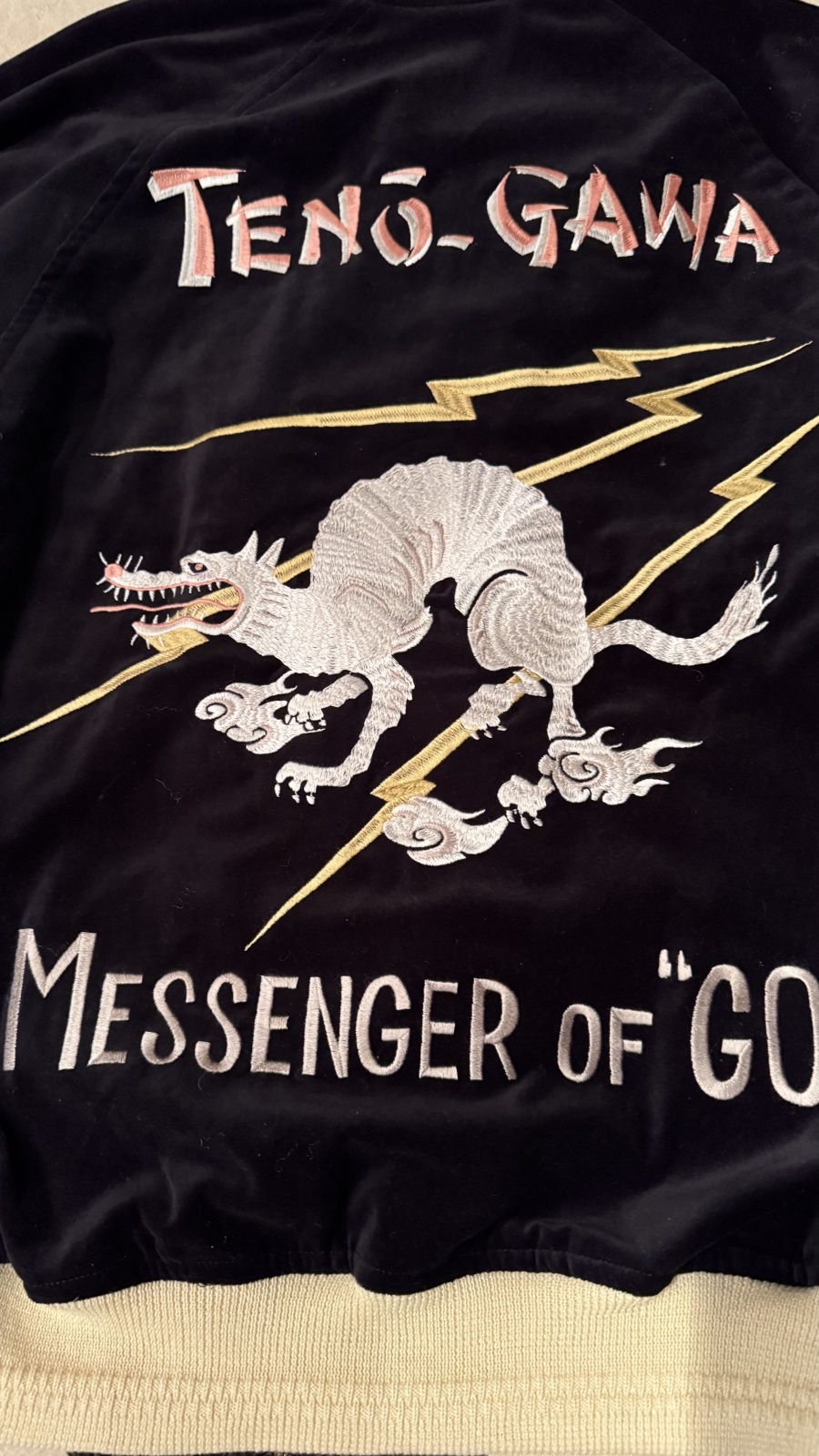 1926年から67年まで開催された『天王川オートレース』にオマージュを込め、日本神話に登場する”神の使い”白狼(ニホンオオカミ)をモチーフに50年代別珍スカジャン特有のチープでありながら存在感のあるスーベニアジャケットに仕上げてあります。