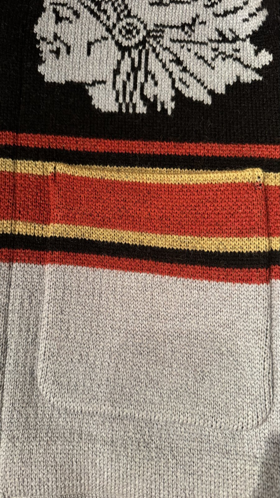 素材はメリノウールを使用でウール特有のチクチク感がしにくく、5ゲージのヘビーな編立をすることによって肉厚でシッカリとした保温性と存在感が得られています。