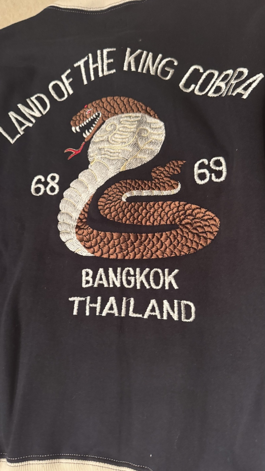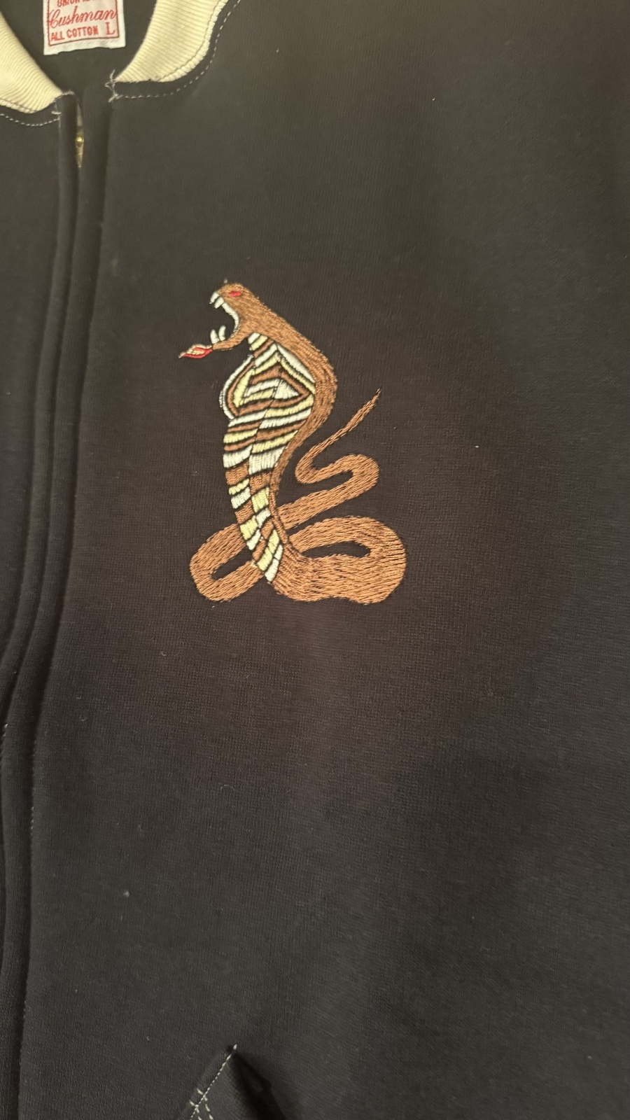 「LAND OF THE KING COBRA」カワカッコいいコブラの刺繍がヴィンテージ感を漂わせ、クッシュマン得意のスウェットをジャケットの様に羽織れるまさに欲しかったフロントジップです。