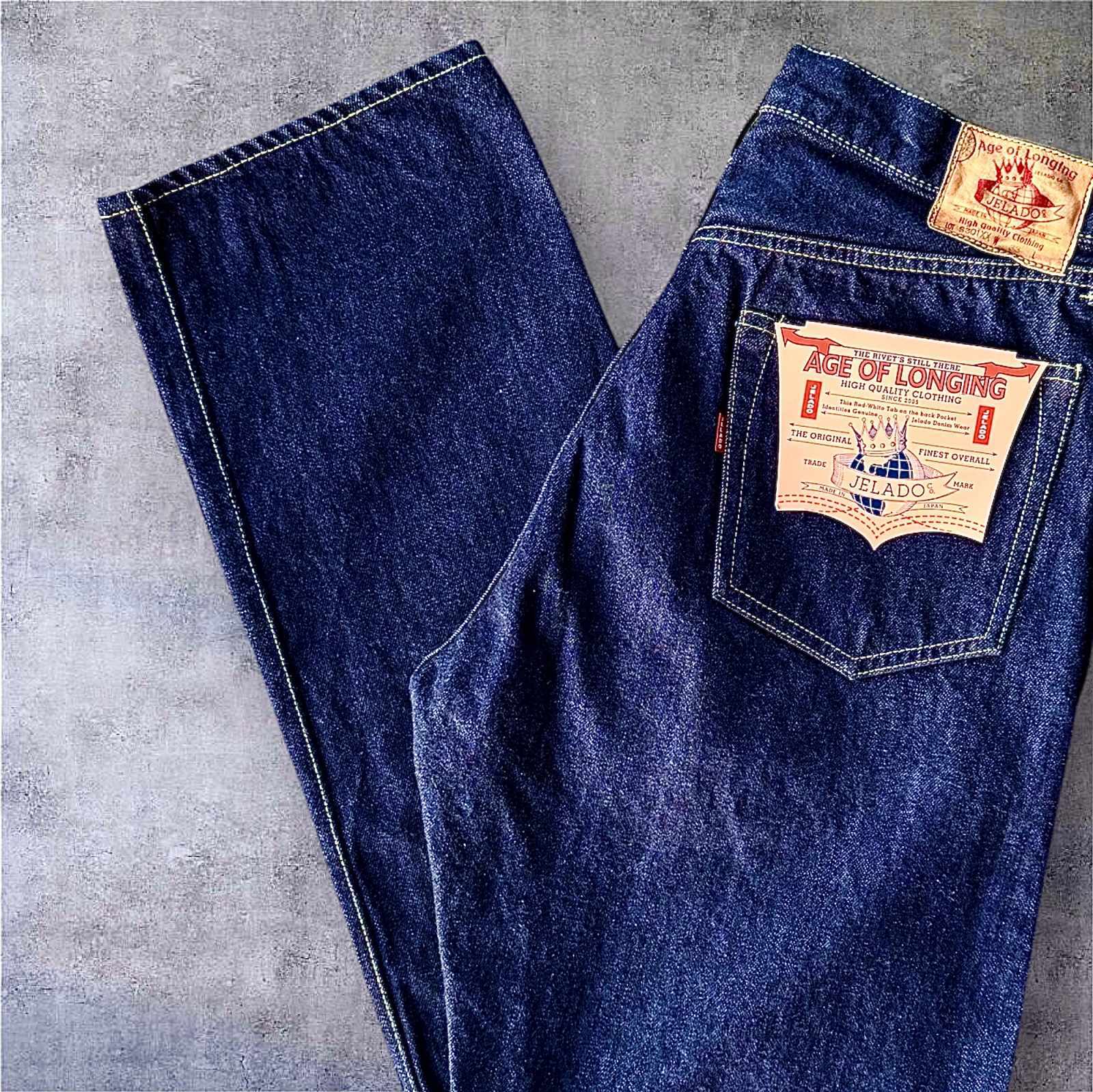 リベットも30年代の在庫リベットをそのまま流用し「JELADO Co」の"o"を小文字にした別注で製作。フロントの持ち出しの切りっぱなしや太めのベルトループなど、大戦モデルならではのディテールも徹底的に再現しています。シルエットは黒タグに近くスッキリとしたラインを採用し、穿くほどに表情が増す不規則な色落ちを楽しむことが出来ます。