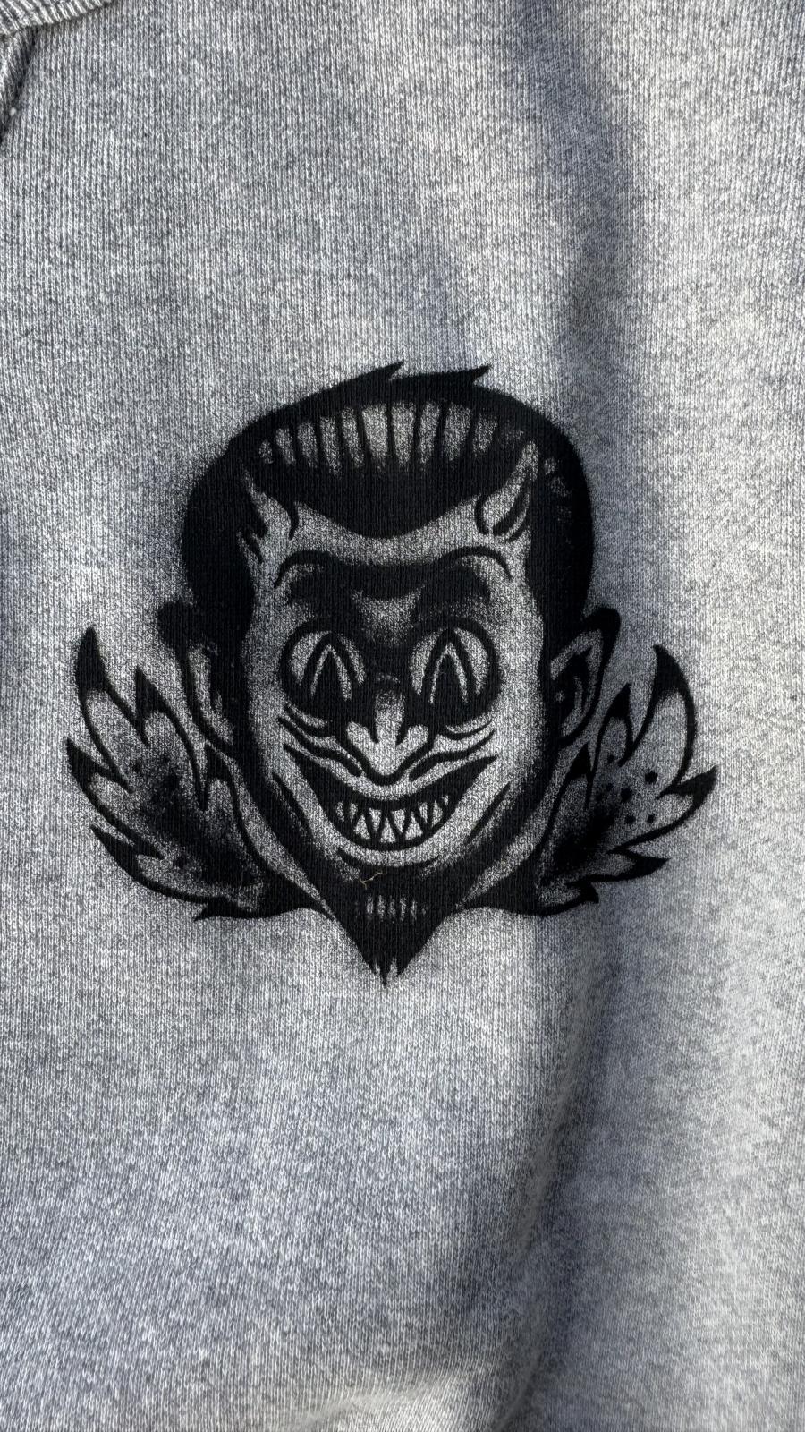 アメカジ、ヴィンテージ好きにはたまらない仕様となっているうえに、今回はナックルさんによって描かれたプリントが胸と背中に施されています。まるでヴィンテージのエアブラシスウェットかと見間違うほどの仕上がりとなっています。