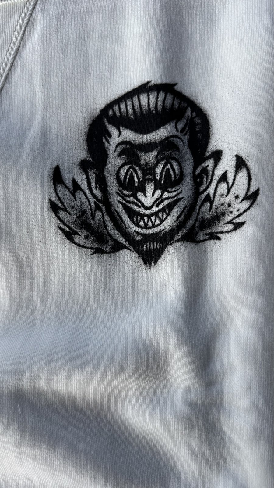 アメカジ、ヴィンテージ好きにはたまらない仕様となっているうえに、今回はナックルさんによって描かれたプリントが胸と背中に施されています。まるでヴィンテージのエアブラシスウェットかと見間違うほどの仕上がりとなっています。