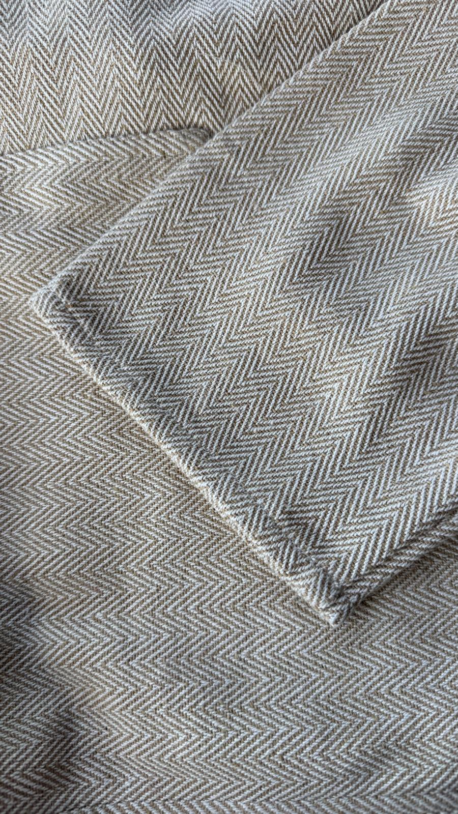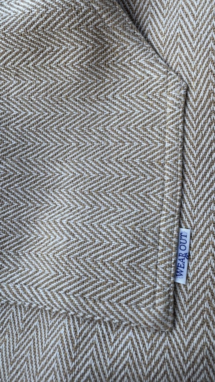 オリジナルの質感と空気感を残しつつ、着心地を重視したコットン/ポリエステルのオリジナルヘリンボーン編みファブリックで仕上げました。しっかりとした質感ながら柔らかく、着込むほどに風合いが増していきます。
