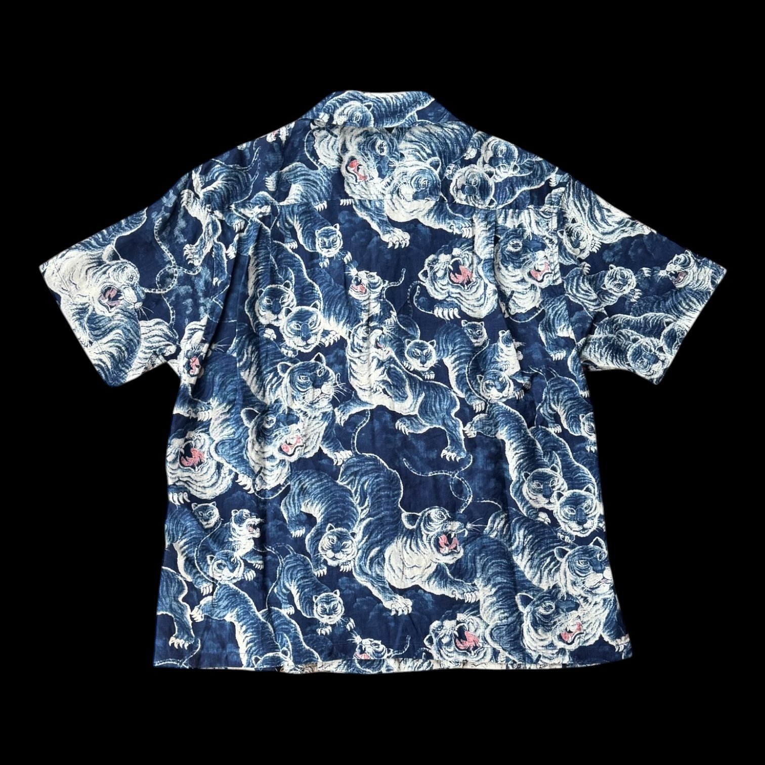 上質なリネン素材にインディゴ染めを施し、熟練の職人による手染めにてヴィンテージの【百虎】柄を再現。 藍色から虎柄を白く抜く”抜染”技法により柄を再現しているので、より藍の濃淡がおりなす表情豊かな描写が絶品の一枚。